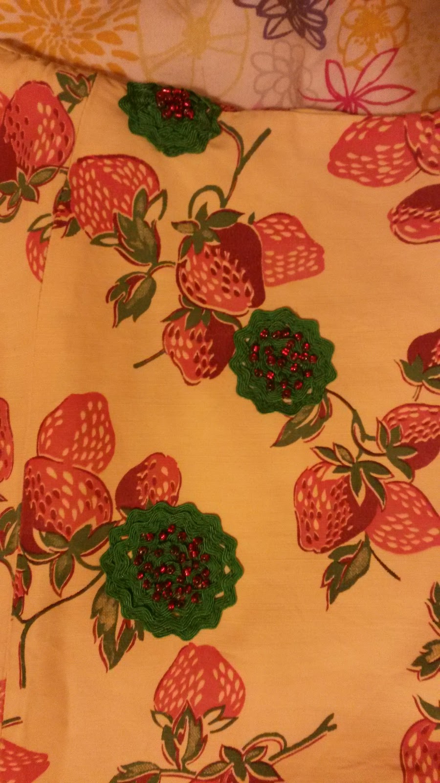 I unpicked the machine stitching yesterday and redarned it by hand. The areas still looked conspicious because of the amount of stitches needed to repair the fabric. I decided to add ric rac flowers to cover the darned areas. To add strength to the fabric, these are backed in yellow cotton. I wanted orange ricrac flowers the same shade of orange as the strawberries and matching red beads.